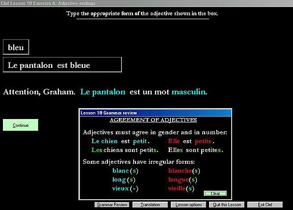 CLEF is a comprehensive French grammar revision package which was originally developed by language teachers in a consortium of Canadian universities. CLEF is an oldie but goodie, well-known for its clever feedback routines that give the learner discrete advice on his/her mistakes - a rarity nowadays, as most CALL programs incorporate nothing more than slick presentations followed by a few point-and-click-let's-move-on-quick exercises.