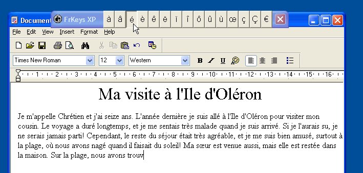 FrKeys is a program by Patrick Smears that facilitates the typing of foreign characters in all recent versions of Windows, e.g. in Word, Excel, Outlook and most other Windows applications. It works by placing a small accent bar at the top of the screen, so gone are the days of pressing convoluted key combinations - all you have to do is click on the letter you need to type.