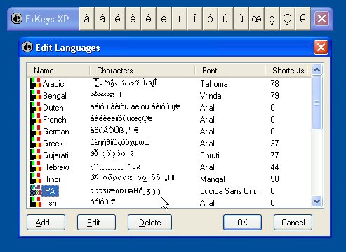 FrKeys 3.0 contains many new features, including a facility for adding the full International Phonetic Alphabet (IPA) and character sets for Hebrew, Arabic, Hindi, Urdu, Punjabi, Gujarati, etc. The following screenshots show the accent bar (for French) at the top, a selection of the many other languages that can be typed using FrKeys, and a Word document in the process of being edited.