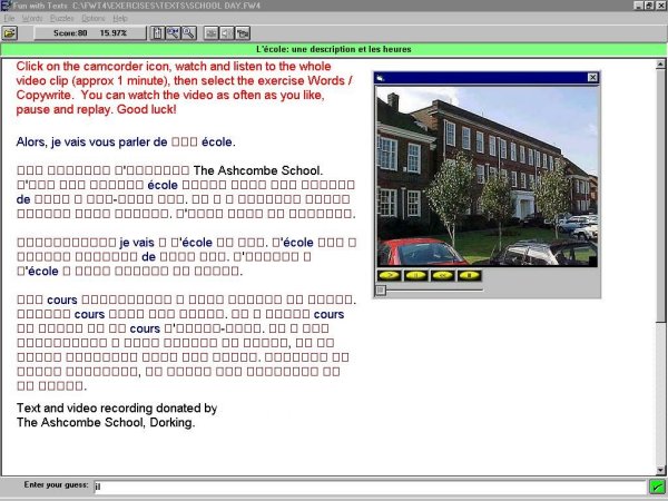 Fun with Texts is an easy-to-use authoring package for creating text manipulation activities for language learners of almost any age. It has been Camsoft's best-selling software package for Modern Foreign Languages since 1985. Using the in-built editor in Fun with Texts, teachers can create their own texts in any language written in the Roman alphabet, or they can copy and paste a text from another source, e.g. a word-processed document or a WWW text. The computer then generates seven differentiated activities automatically: