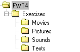 The Teacher's Program operates essentially in the same way as the original Version 3.0 Teacher's Program - see the new, downloadable Fun with Texts Handbook. The difference is that you can now associate any text that you create with a picture file, an audio file or a video file, which must be stored respectively in the Pictures, Sounds and Movies subdirectories - see directory structure illustration (above). Fun with Texts does not contain facilities for creating and editing picture files, sound files or movie files, but you can use any standard packages for producing such files. For further information on creating, editing and converting multimedia files see Section 2.2.3 of Module 2.2 at the ICT for Language Teachers (ICT4LT) website: http://www.ict4lt.org