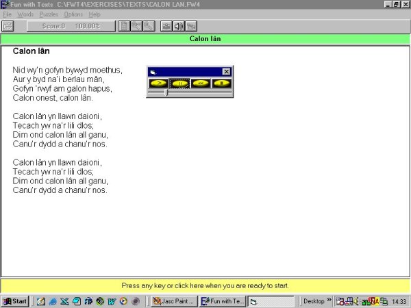 The Student's Program operates essentially in the same way as the original Version 3.0 program - see the new, downloadable Fun with Texts 4.0 Handbook. If a picture, sound or movie file is associated with the text then the relevant multimedia icon will appear in bold on the grey menu bar bar at the top of the screen. Clicking on the camera icon will cause a picture to pop up on screen. You can resize the picture and move it around the screen. Clicking on the loudspeaker icon will cause an audio control bar to pop up. You can then play the audio file, rewind it, replay it and use the "slider" to find a specific point in the file. You can move the audio control bar around the screen. Clicking on the camcorder icon will cause a video window to to pop up with a control bar underneath - rather like the audio control bar. You can then play the video file, rewind it, replay it and use the "slider" to find a specific point in the file. You can resize the video window and move it around the screen.