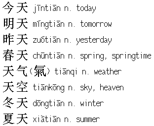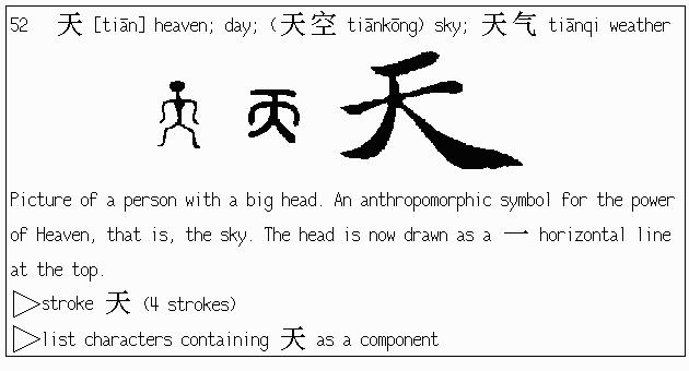 Wenlin's electronic dictionary includes pictures of ancient and modern forms of Chinese characters, along with explanations, to help you understand and remember the shapes of Chinese characters. Here we see that the Chinese character for 'day' is also the character for 'heaven' and 'sky', and it originally depicted a human figure. By clicking on the pronunciation (which is tian, pronounced in the high level tone), you could hear recordings of the pronunciation (in both male and female voices) (Wenlin includes recordings of all the Mandarin syllables). Below the explanation, two "triangle buttons" are visible. By clicking on the triangle labeled "stroke... (4 strokes)" you could see how to write the character stroke-by-stroke. (Wenlin can display over ten thousand different characters, using their conventional stroke orders.) Another triangle button gives you the option of viewing a list of all the Chinese characters which contain the 'heaven' character as a component. This kind of list can help you learn the differences between similar looking characters. Other interesting and useful features are available by scrolling down and clicking on more triangle buttons.