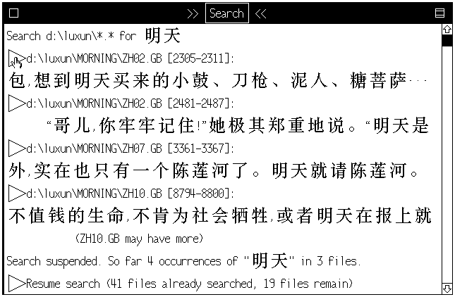 This is what you would see if you used Search Files to find examples of mingtian 'tomorrow' in a collection of stories and essays by the famous 20th-century author Lu Xun, if you suspended the search after four occurrences had been found. (You can suspend a search at any time, and then resume it at any time.) The window displays the name of each file, the position of the occurrence, and the line that contains the occurrence. To open one of the files and see the full context of an occurrence, you could click on the triangle button next to the file name.